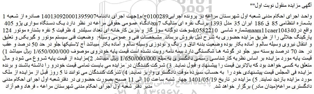 واحد اجرای احکام مدنی شعبه اول شهرستان مراغه در پرونده اجرایی0100289ج/م1جهت اجرای دادنامه140130920001395907 صادره از شعبه 1 دادگاه عمومی حقوقی مراغه در نظر دارد یک دستگاه سواری پژو 405 xu7 بشماره انتظامی 85 ق 186 ایران 35 مدل 1393 برنگ نقره ای متالیک سوخت دوگانه سوز گاز و بنزین کارخانه ای تعداد سیلندر 4 ظرفیت 5 نفره بشناره موتور 124k0582210 بشماره شاسی naam11caer104340واقع در پارکینگ جلالی را از طریق مزایده حضوری به شرح ذیل بفروش برساند. مشخصات فنی و عمومی وسیله: وضعیت فنی سیستم موتور و گیربکس و تعلیق و انتقال نیروی وسیله سالم و آماده بکار بوده وضعیت بدنه اتاق و رنگ و تودوزی وسیله سالم و آماده بکار میباشد آج لاستیکها جلو در حد 50 درصد و عقب در حد 70 درصد پوسته سپر جلو در گوشه ها شکستگی دارد بیمه نامه رویت نشده است قیمت پایه خودروی موصوف 1/650/000/000 ریال میباشد 1) قیمت پایه مورد مزایده بر اساس نظریه کارشناسی رسمی دادگستری به مبلغ 1/650/000/000 ریال میباشد. 2)مزایده از قیمت پایه شروع می شود و مال متعلق به کسی خواهد بود که بالاترین قیمت را پیشنهاد و قبول نماید. 3) شرکت کنندگان در مزایده می بایست تمامی قیمت خودرو را داشته باشند و برنده مزایده فی المجلس قیمت پیشنهادی خود را به حساب سپرده موقت دادگستری واریز نماید. 4) شرکت کنندگان می توانند تا 5 روز قبل از مزایده از ملک مورد مزایده بازدید نمایند. 5) مزایده در تاریخ 1401/05/19 چهار شنبه ساعت 10 الی 11 صبح بصورت حضوری در دفترشعبه اول اجرای احکام مدنی دادگستری مراغه(میدان مادر) برگزار خواهد شد.