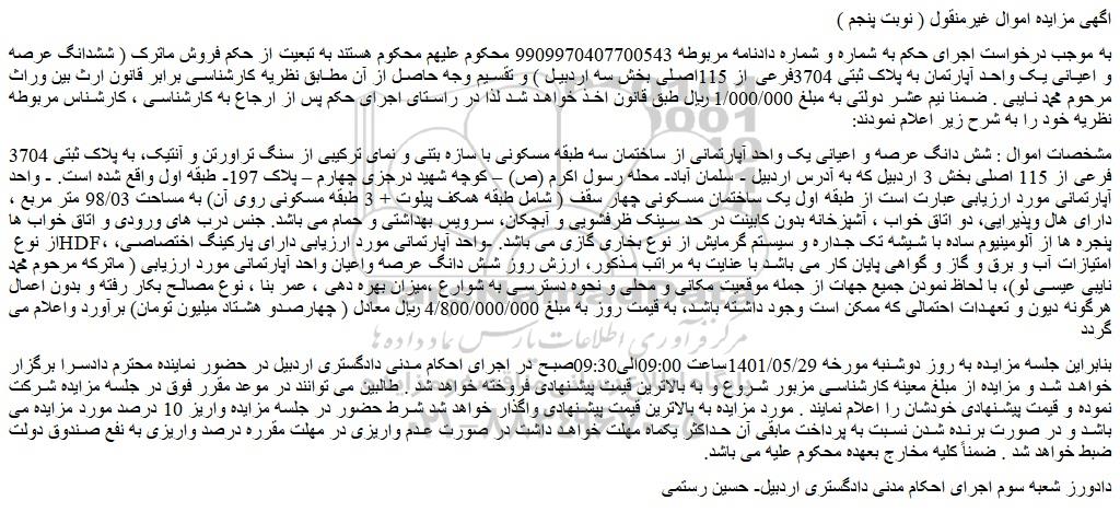 به موجب درخواست اجرای حکم به شماره و شماره دادنامه مربوطه 9909970407700543 محکوم علیهم محکوم هستند به تبعیت از حکم فروش ماترک ( ششدانگ عرصه و اعیانی یک واحد آپارتمان به پلاک ثبتی 3704فرعی از 115اصلی بخش سه اردبیل ) و تقسیم وجه حاصل از آن مطابق نظریه کارشناسی برابر قانون ارث بین وراث مرحوم محمد نایبی . ضمنا نیم عشر دولتی به مبلغ 1/000/000 ریال طبق قانون اخذ خواهد شد لذا در راستای اجرای حکم پس از ارجاع به کارشناسی ، کارشناس مربوطه نظریه خود را به شرح زیر اعلام نمودند: