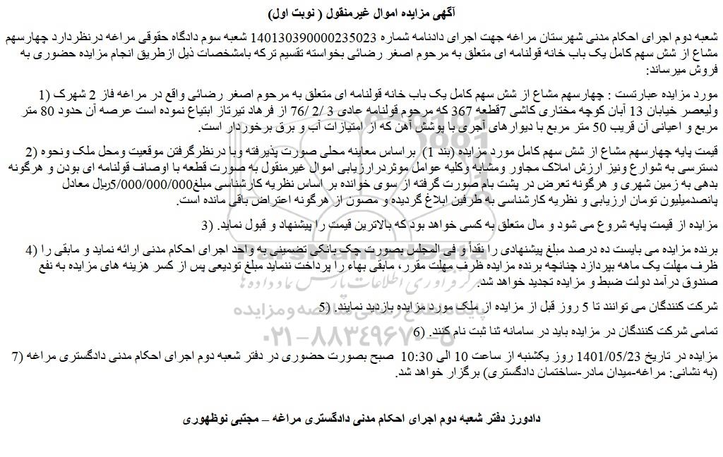 مزایده فروش  چهارسهم مشاع از شش سهم کامل یک باب خانه قولنامه ای