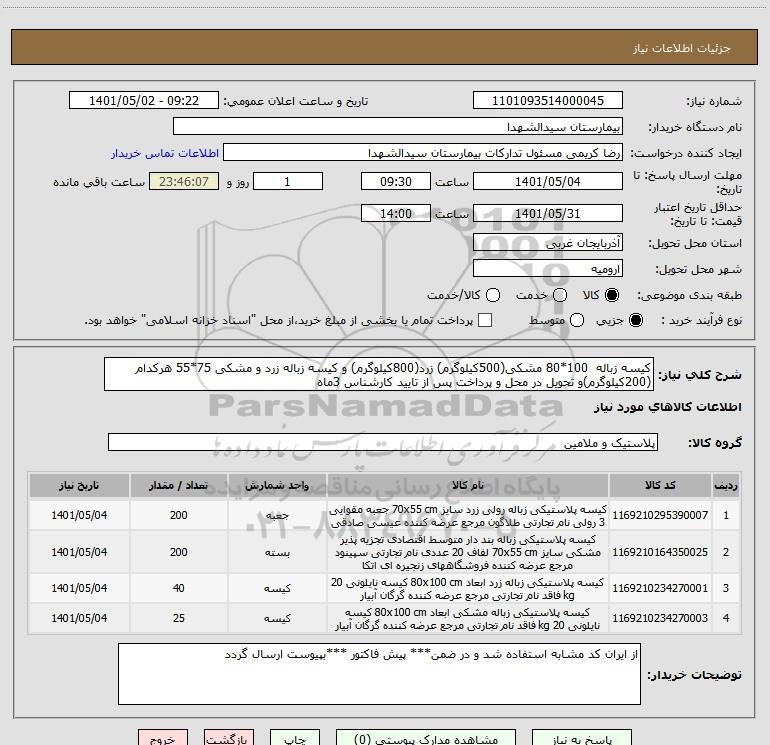 شرح کلی نیاز: کیسه زباله 100*80 مشکی(500کیلوگرم) زرد(800کیلوگرم) و کیسه زباله زرد و مشکی 75*55 هرکدام (200کیلوگرم)و تحویل در محل و پرداخت پس از تایید کارشناس 3ماه