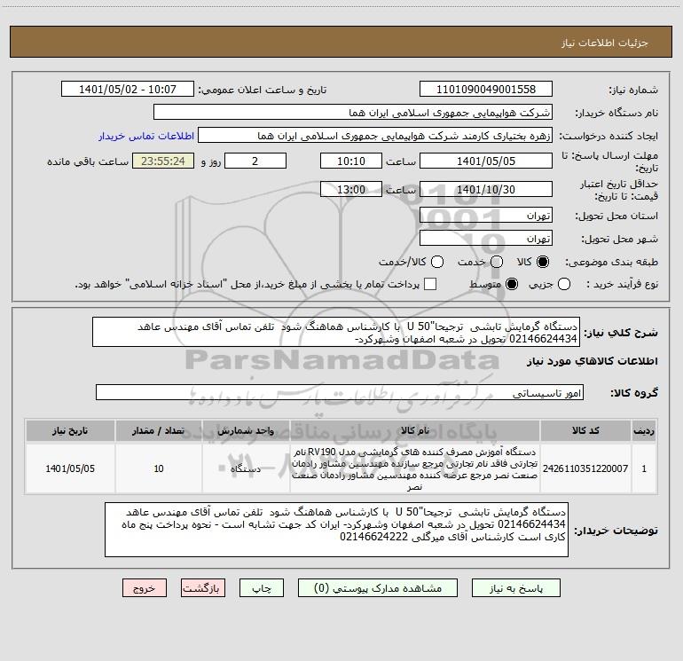 شرح کلی نیاز: دستگاه گرمایش تابشی ترجیحا"50 U با کارشناس هماهنگ شود تلفن تماس آقای مهندس عاهد 02146624434 تحویل در شعبه اصفهان وشهرکرد-
