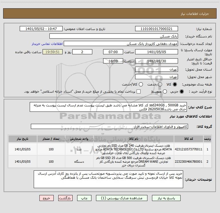 شرح کلی نیاز: خرید ssd240Gb , 500GB کد کالا مشابه می باشد طبق لیست پیوست عدم ارسال لیست پیوست به منزله حذف می باشد26205036 فکس