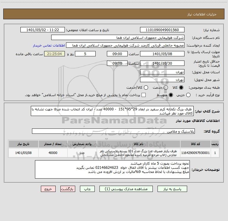شرح کلی نیاز: ظرف بزرگ تکخانه کرم سفید در ابعاد 29*95*151 - 40000 عدد - ایران کد انتخاب شده صرفا جهت تشابه با کالای مورد نظر میباشد