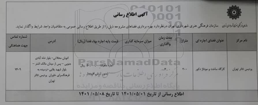 | پردیس تئاتر تهران | کارگاه ساخت و مونتاژ دکور | 200 | 3 | - | اجاره ماهیانه 50.000.000 ریال (بدون ارزش افزوده) |