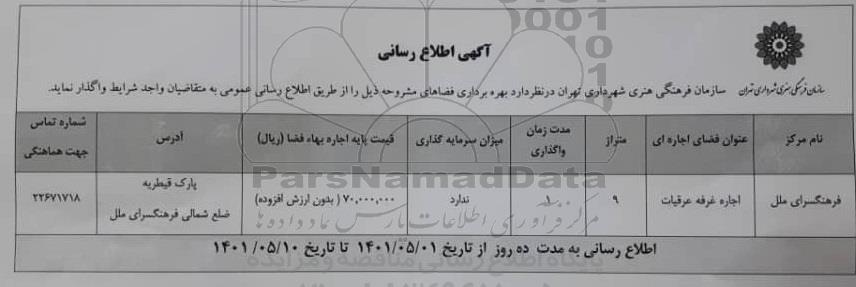 مزایده عمومی اطلاع رسانی بهره برداری فضاهای مشروحه فرهنگسرای ملل برگزار میگردد. از کلیه افراد متخصص و شرکتهای واجد شرایط دعوت به عمل میآید تا در این مزایده با کد خبرگزاری پارس نماد : 4752086 شرکت نمایند تاریخ شروع مزایده : 1401/05/01 مهلت شرکت در مزایده: تا پایان روز 1401/05/10 مکان برگزاری اموال واگذاری استانهای تهران و دستهبندیهای مربوط به این حراجی سرمایه گذاری, واگذاری ورزشگاه، پارکینگ، غرفه و بوفه میباشد.