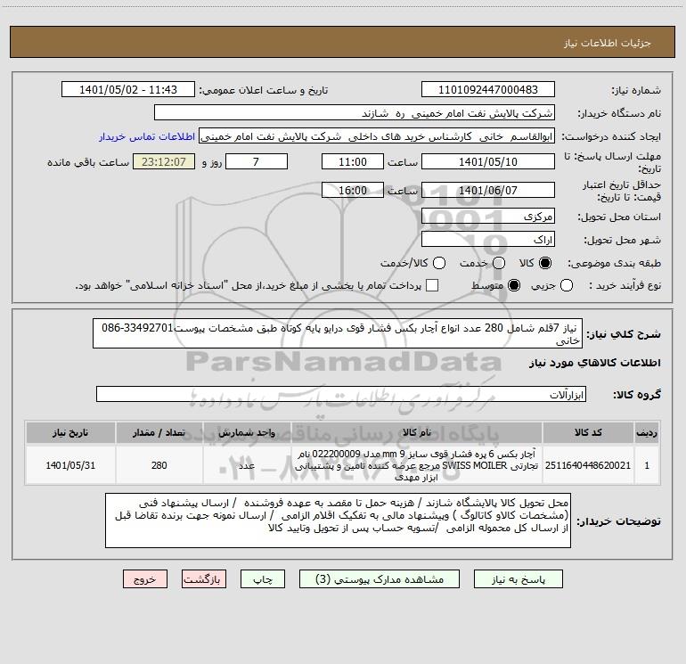 شرح کلی نیاز: نیاز 7قلم شامل 280 عدد انواع آچار بکس فشار قوی درایو پایه کوتاه طبق مشخصات پیوست33492701-086 خانی