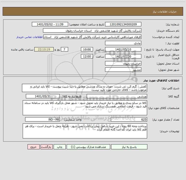 نام دستگاه خریدار:شرکت پالایش گاز شهید هاشمی نژاد استان خراسان رضوی
