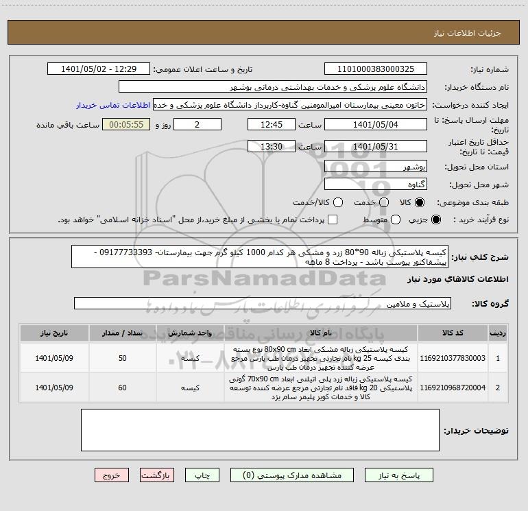 شرح کلی نیاز: کیسه پلاستیکی زباله 90*80 زرد و مشکی هر کدام 1000 کیلو گرم جهت بیمارستان- 09177733393 - پیشفاکتور پیوست باشد - پرداخت 8 ماهه