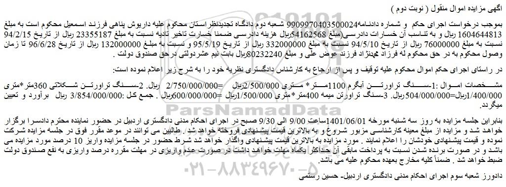 بموجب درخواست اجرای حکم  و شماره دادنامه9909970403500024 شعبه دوم دادگاه تجدیدنظراستان محکوم علیه داریوش پناهی فرزند اسمعیل محکوم است به مبلغ 1604644813 ریال و به تناسب آن خسارات دادرسی(مبلغ 54162568ریال هزینه دادرسی ضمنا خسارت تاخیر تادیه نسبت به مبلغ 23355187 ریال از تاریخ 94/2/15 نسبت به مبلغ 76000000 ریال از تاریخ 94/5/10 نسبت به مبلغ 332000000 ریال از تاریخ 95/5/19 و نسبت به مبلغ 132000000 ریال از تاریخ 96/6/28 تا زمان وصول محکوم به در حق محکوم له فرزاد محمدنژاد فرزند عوض علی و مبلغ 80232240ریال بابت نیم عشردولتی درحق صندوق دولت .
