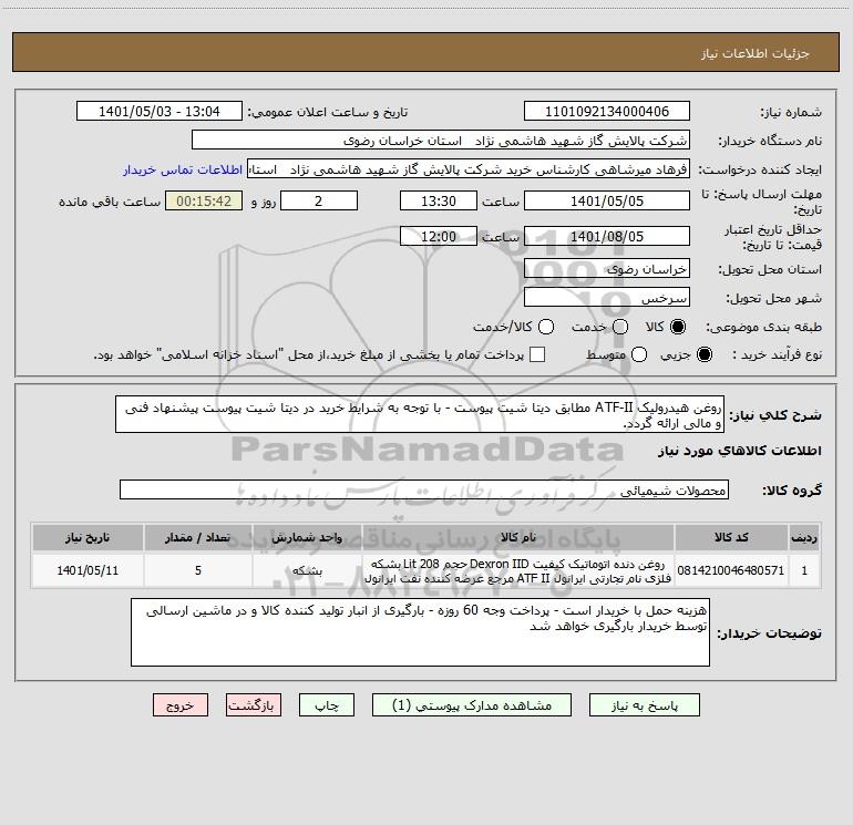 نام دستگاه خریدار:شرکت پالایش گاز شهید هاشمی نژاد استان خراسان رضوی