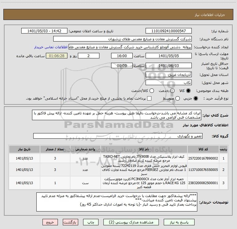 استعلام بها و موضوع استعلام استعلام ایران کد مشابه می باشد-درخواست دقیقا طبق پیوست- هزینه حمل بر عهده تامین کننده- ارائه پیش فاکتور با مشخصات فنی الزامی می باشد به اطلاع کلیه شرکت‌ها و افراد متخصص واجد شرایط می‌رساند، آگهی گذار در نظر دارد از طریق استعلام بها، نسبت به انتخاب و دریافت پیشنهادات اقدام نماید. این استعلام با کد آگهی ثبت شده در سامانه خبرگزاری پارس نماد : 4757838 منتشر شده است. مشخصات استعلام : تاریخ شروع استعلام: 1401/05/03 آخرین مهلت ارسال پیشنهاد قیمت : 1401/05/05 و محل اجرای پروژه : استان آذربایجان غربی میباشد. استعلام قیمت مورد درخواست : استعلام ایران کد مشابه می باشد-درخواست دقیقا طبق پیوست- هزینه حمل بر عهده تامین کننده- ارائه پیش فاکتور با مشخصات فنی الزامی می باشد با دسته‌بندی‌های تخصصی و گروه های مرتبط : ابزار و یراق آلات, البسه و پوشاک, نوشت افزار, استعلام اطلاع رسانی میگردد.