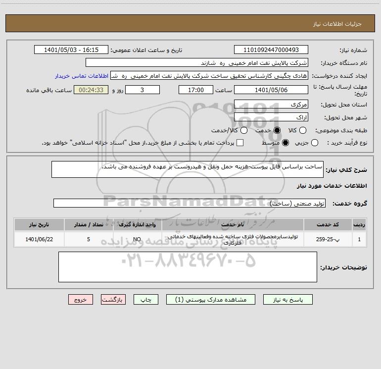 شرح کلی نیاز: ساحت براساس فایل پیوست-هزینه حمل ونقل و هیدروتست بر عهده فروشنده می باشد.