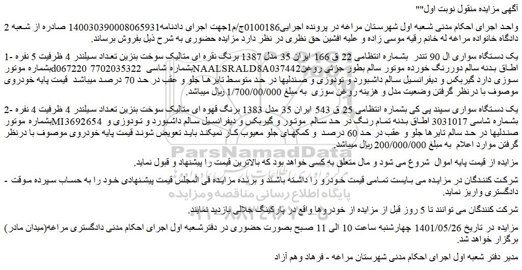 مزایده در تاریخ 1401/05/26 چهارشنبه ساعت 10 الی 11 صبح بصورت حضوری در دفترشعبه اول اجرای احکام مدنی دادگستری مراغه(میدان مادر) برگزار خواهد شد.