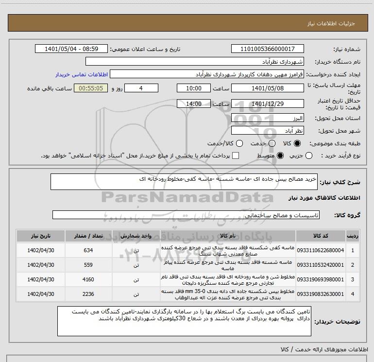 توضیحات خریدار:تامین کنندگان می بایست برگ استعلام بها را در سامانه بارگذاری نمایند-تامین کنندگان می بایست دارای پروانه بهره بردرای از معدن باشند و در شعاع 30کیلومتری شهرداری نظرآباد باشند