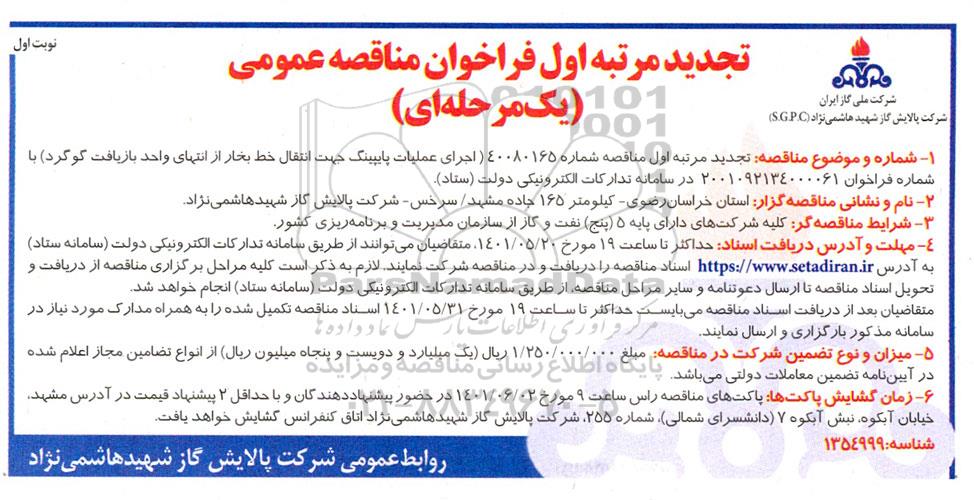 1- شماره موضوع مناقصه: تجدید مرتبه اول مناقصه شماره 40080165 (اجرای عملیات پایپینگ جهت انتقال خط بخار از انتهای واحد بازیافت گوگرد ) با شماره فراخوان 2001092134000061 در سامانه تدارکات الکترونیکی دولت ستاد