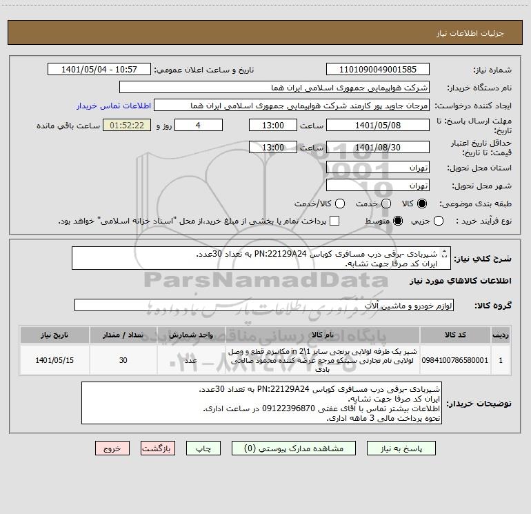 استعلام شیربادی -برقی درب مسافری کوباس PN:22129A24 به تعداد 30عدد. ایران کد صرفا جهت تشابه. اطلاعات بیشتر توضیحات مطالعه شود., استعلام شیربادی -برقی درب مسافری کوباس PN:22129A24 به تعداد 30عدد. ایران کد صرفا جهت تشابه. اطلاعات بیشتر توضیحات مطالعه شود.