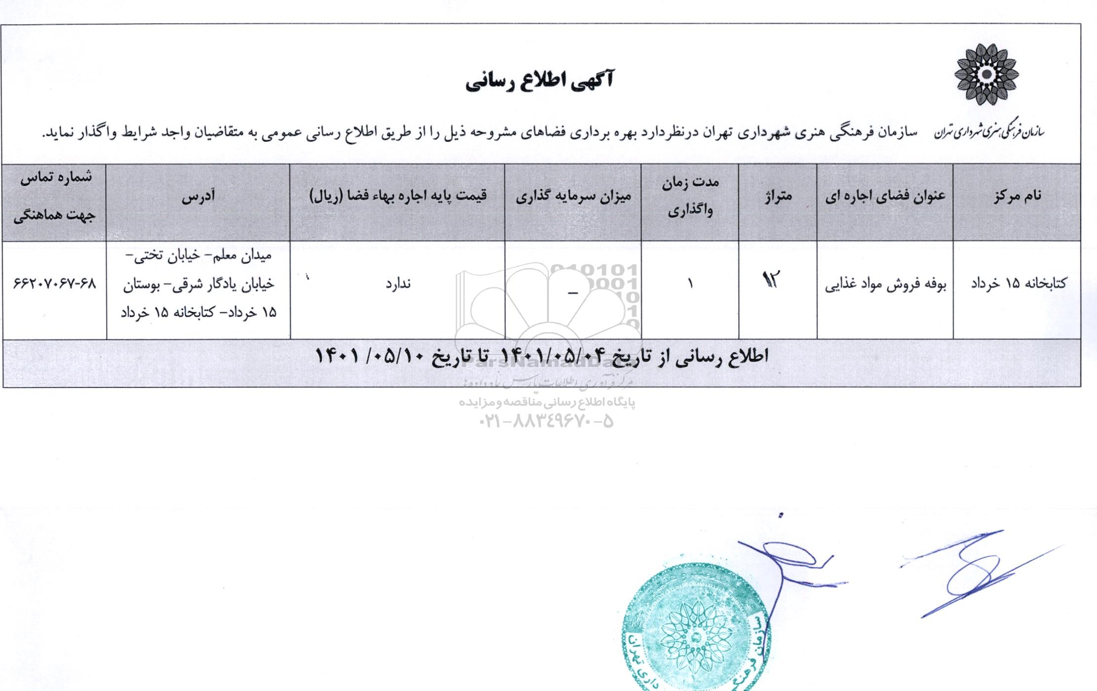 سازمان فرهنگی هنری شهرداری تهران در نظر دارد بهره برداری فضاهای مشروحه ذیل را از طریق اطلاع رسانی عمومی به متقاضیان واجدشرایط واگذار نماید.