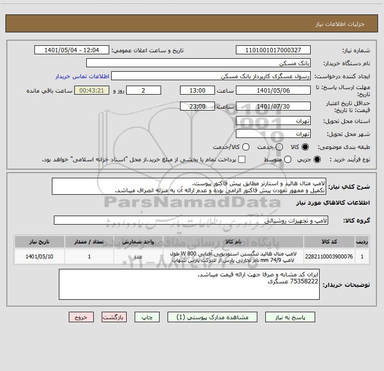 شرح کلی نیاز: لامپ متال هالید و استارتر مطابق پیش فاکتور پیوست. تکمیل و ممهور نمودن پیش فاکتور الزامی بوده و عدم ارائه آن به منزله انصراف میباشد.