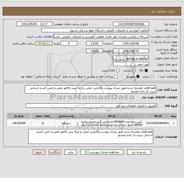 شرح کلی نیاز: فقط اقلام خواسته شده طبق مدرک پیوست وگارانتی اصلی و ارایه پیش فاکتور معتبر و تامین کننده استانی ترتیب اثر داده میشود