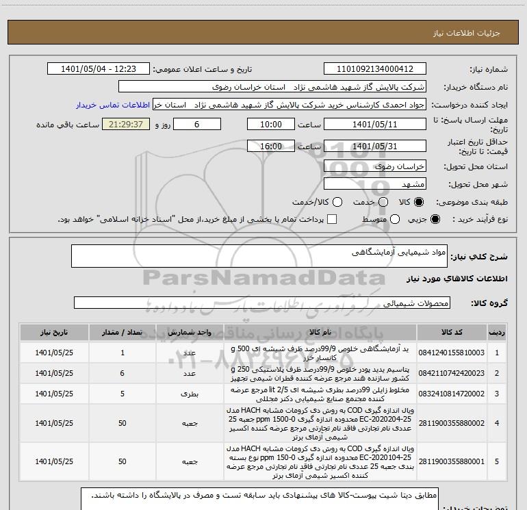 نام دستگاه خریدار:شرکت پالایش گاز شهید هاشمی نژاد استان خراسان رضوی