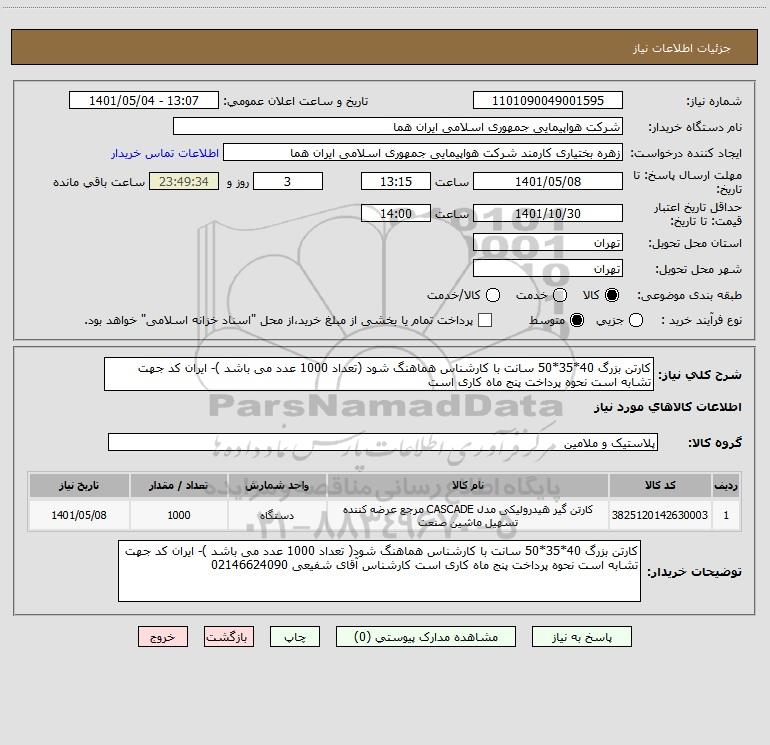 شرح کلی نیاز: کارتن بزرگ 40*35*50 سانت با کارشناس هماهنگ شود (تعداد 1000 عدد می باشد )- ایران کد جهت تشابه است نحوه پرداخت پنج ماه کاری است