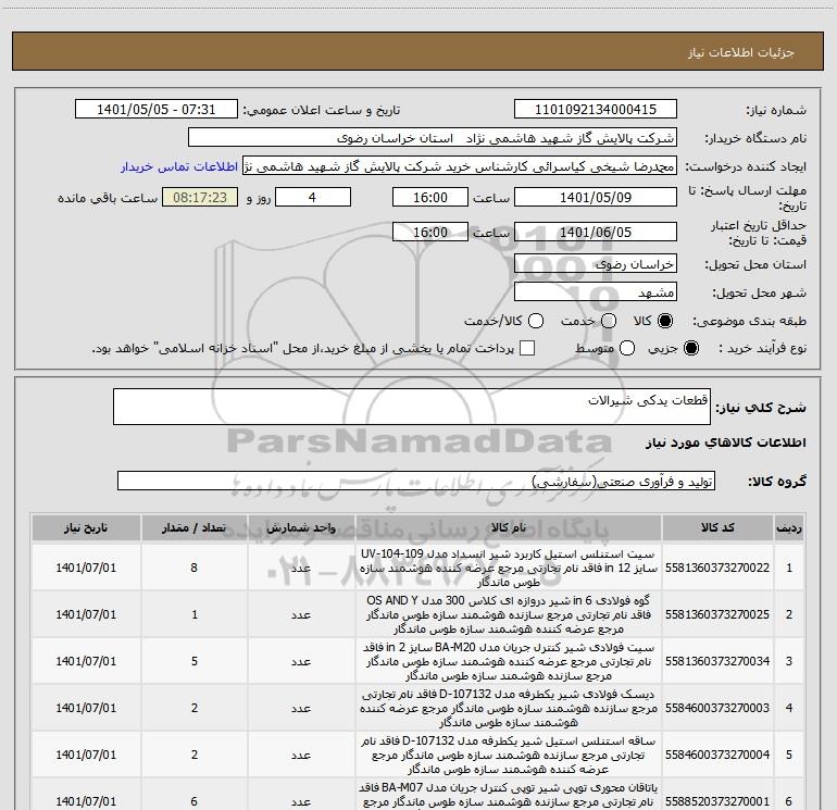 نام دستگاه خریدار:شرکت پالایش گاز شهید هاشمی نژاد استان خراسان رضوی
