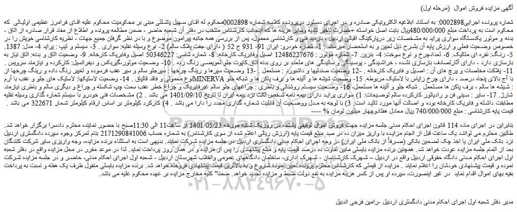 شماره پرونده اجرایی0002898: به استناد ابلاغیه الکترونیکی صادره و در اجرای دستور درپرونده کلاسه شماره 0002898محکوم له اقای سهیل پاشلئی مبنی بر محکومیت محکوم علیه اقای فرامرز عظیمی اولیائی که محکوم است به پرداخت مبلغ 480/000/000ریال بابت اصل خواسته +خسارت تاخیر تادیه وسایر هزینه ها که اینجانب کارشناس منتخب در دفتر آن شعبه حاضر ، ضمن مطالعه پرونده و اطلاع از مفاد قرار صادره از اتاق ، بدنه و موتور یکدستگاه سواری پراید به مشخصات زیر درپارکینگ اقبالی اردبیل ، بازدید فنی و کارشناسی معمول، پس از بررسی همه جانبه پیرامون موضوع و با در نظر گرفتن جمیع جهات ، نظریه کارشناسی خویش را در خصوص وضعیت فعلی و ارزش پایه آن بشرح ذیل تعیین و به استحضار میرساند : 1- شماره خودرو: ایران 91- 931 ج 52 ( دارای جفت پلاک سالم) 2- نوع وسیله نقلیه: سواری . 3- سیستم و تیپ : پراید 4- مدل: 1387. 5- رنگ: نقره ای متالیک. 6- تعدادچرخ و نوع سوخت: 4- بنزین. 7- شماره موتور : 12486227676 اصیل وفابریک کارخانه. 8- شماره شاسی: 50346227 اصیل وفابریک کارخانه. 9- وضعیت اتاق و بدنه: اتاق نیاز به بازسازی دارد ، دارای آثارتصادف بازسازی نشده ، خراشیدگی ، پوسیدگی و سائیدگی های متعدد بر روی بدنه اتاق.کاپوت جلو تعویضی زنگ زده . 10- وضعیت موتور،گیربکس و دیفرانسیل: کارکرده و نیازمند سرویس . 11- پلاکت مختصات و پرچ های آن : اصیل و فابریک کارخانه . -12 وضعیت صندلیها و داشبورد : مستعمل . -13 وضعیت سپرها و رینگ چرخها : سپرجلو سالم و سپر عقب فرسوده و تغییر رنگ داده و رینگ چرخها از نوع معمولی و فاقد قالپاق . 14- وضعیت لاستیکها: لاستیک های جلو و عقب با آرمMINERVA با آج بالای پنجاه درصد ، دارای چرخ زاپاس با لاستیک مربوطه. 15- وضعیت شیشه ها و آئینه ها و برف پاکن ها و شبکه جلو : شیشه ها سالم ، برف پاکن ها مستعمل . شبکه جلو و آئینه ها مستعمل، 16- وضعیت سیستم روشنائی و باطری : چراغهای جلو سالم غیرفابریک و چراغ خطر عقب سمت چپ شکسته و چراغ و دیگری سالم و باطری نیازمند شارژ. 17- سایر : سینی فن و رادیاتور کارکرده سالم توضیحات: 1) سواری پراید دارای بیمه نامه شخص ثالث نزد بیمه ایران تا تاریخ 1401/09/10 می باشد . 2) مشخصات فنی خودرو با سیستم شماره گذاری وسیله نقلیه مطابقت داشته و فابریک کارخانه بوده و اصالت آنها مورد تائید است. 3) با توجه به مدل ووضعیت آن قابلیت شماره گذاری مجدد را دارا می باشد . 4) کارکرد کیلومتر بر اساس ارقام کیلومتر شمار 322671 می باشد . قیمت پایه کارشناسی : مبلغ 740/000/000 ریال معادل هفتادوچهار میلیون تومان % ----