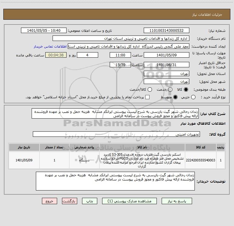 شرح کلی نیاز: زندان رجائی شهر گیت بازرسی به شرح لیست پیوستی ایرانکد مشابه هزینه حمل و نصب بر عهده فروشنده ارائه پیش فاکتور و مجوز فروش پیوست در سامانه الزامی