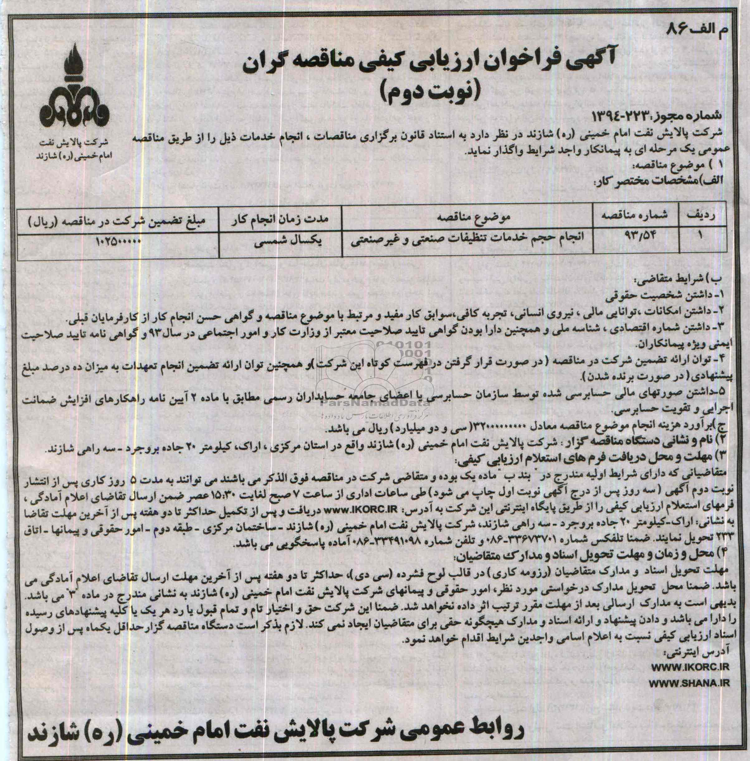 شرکت پالایش نفت امام خمینی ره شازند در نظر دارد به استناد قانون برگزاری مناقصات، انجام خدمات ذیل را از طریق برگزاری مناقصه عمومی یک مرحله ای به پیمانکار واجد شرایط واگذار نماید.