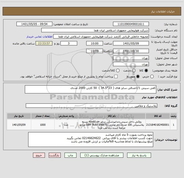شرح کلی نیاز: کفی سینی 1/1صدفی سایز های ( 23*34.5 ) 50 کارتن 2000 عددی