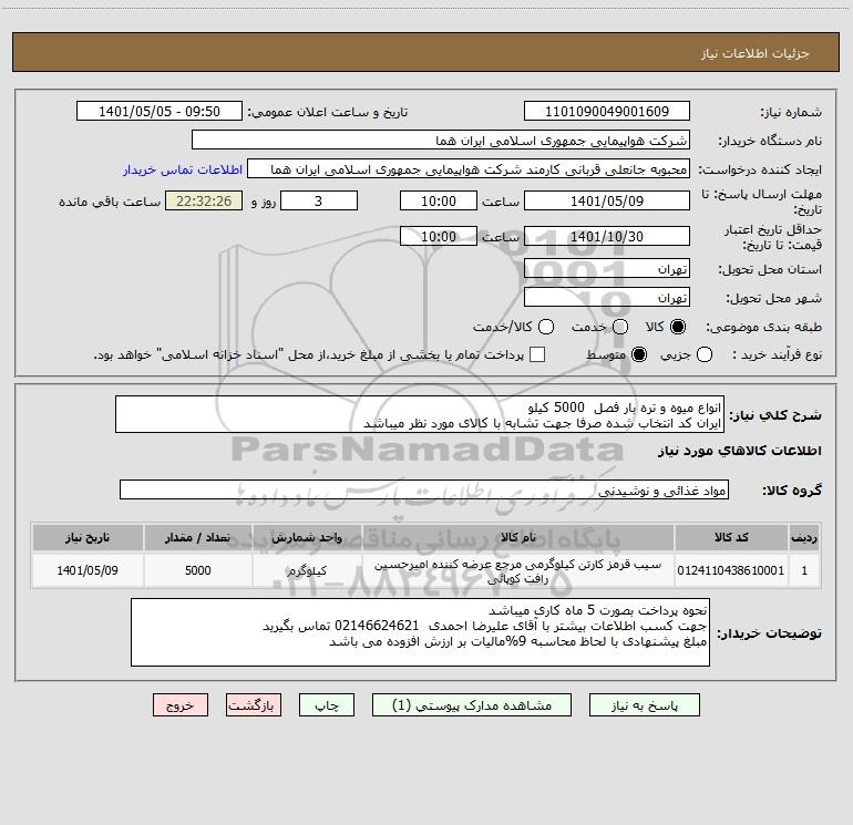 شرح کلی نیاز: انواع میوه و تره بار فصل 5000 کیلو