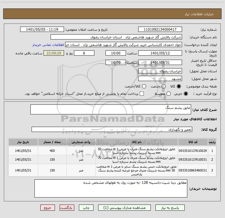نام دستگاه خریدار:شرکت پالایش گاز شهید هاشمی نژاد استان خراسان رضوی