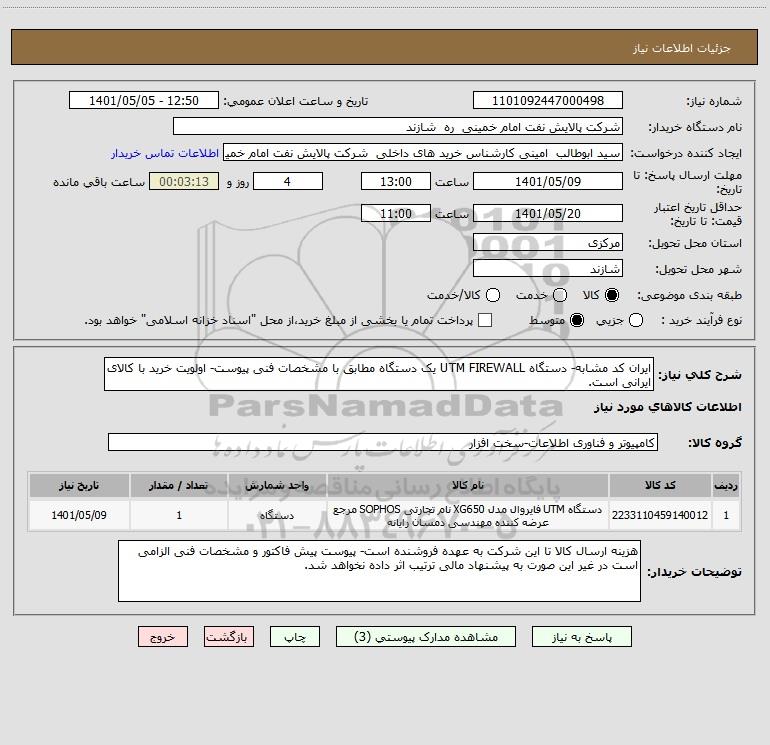 شرح کلی نیاز: ایران کد مشابه- دستگاه UTM FIREWALL یک دستگاه مطابق با مشخصات فنی پیوست- اولویت خرید با کالای ایرانی است.