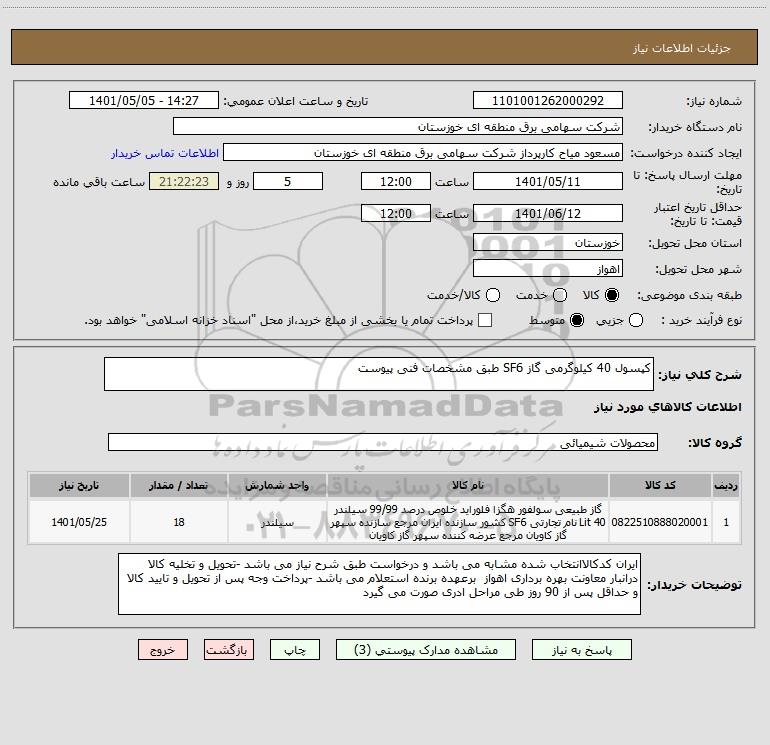 شرح کلی نیاز: کپسول 40 کیلوگرمی گاز SF6 طبق مشخصات فنی پیوست