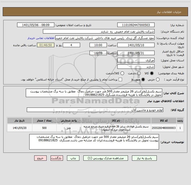 توضیحات خریدار:سیم بکسل(وایر)سایز 26 میلیمتر مقدار 500 متر جهت جرثقیل دماگ مطابق با سه برگ مشخصات پیوست تحویل در پالایشگاه با هزینه فروشنده.ایران کد مشابه می باشد.عسگری 09188621825