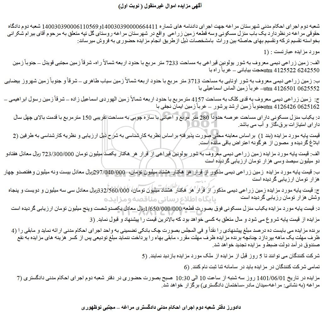 شعبه دوم اجرای احکام مدنی شهرستان مراغه جهت اجرای دادنامه های شماره 140030390000664411و140030390006110569 شعبه دوم دادگاه حقوقی مراغه درنظردارد یک باب منزل مسکونی وسه قطعه زمین زراعی واقع در شهرستان مراغه روستای گل تپه متعلق به مرحوم آقای بیرام شکرانی بخواسته تقسیم ترکه وتقسیم بهای حاصله بین وراث بامشخصات ذیل ازطریق انجام مزایده حضوری به فروش میرساند: