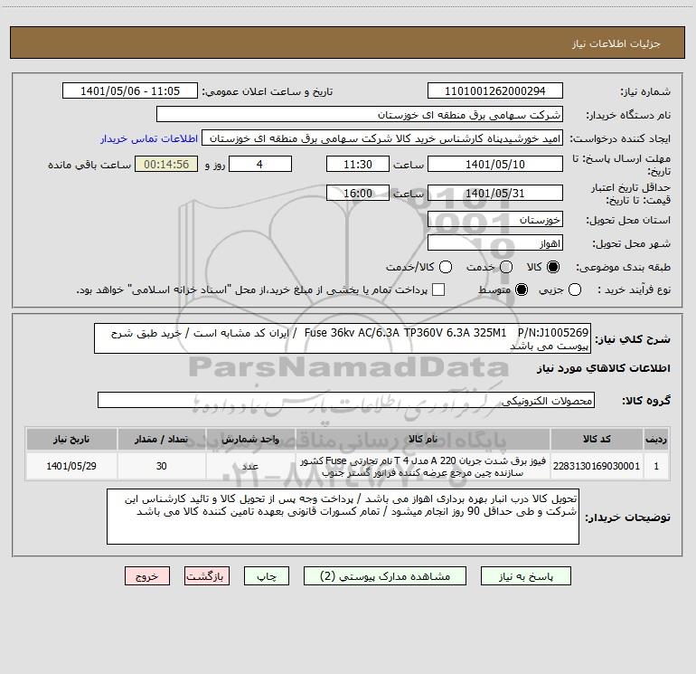 شرح کلی نیاز: Fuse 36kv AC/6.3A TP360V 6.3A 325M1 P/N:J1005269 / ایران کد مشابه است / خرید طبق شرح پیوست می باشد