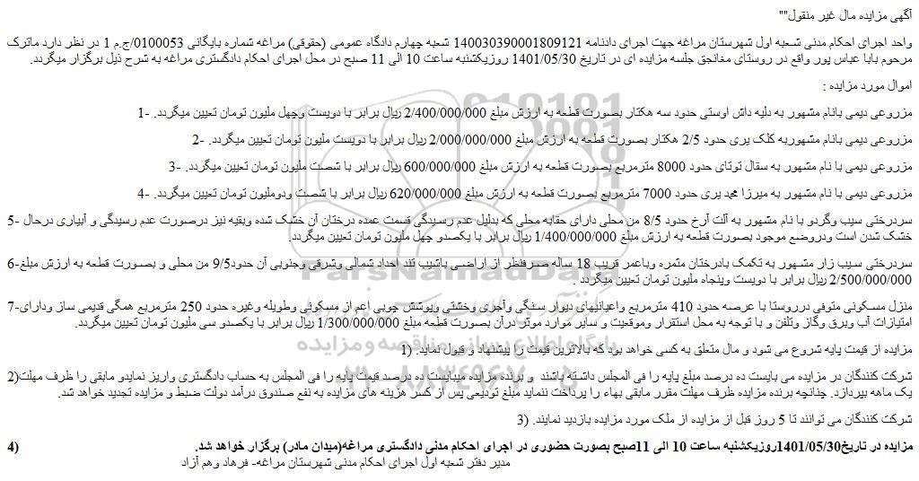 واحد اجرای احکام مدنی شعبه اول شهرستان مراغه جهت اجرای دادنامه 140030390001809121 شعبه چهارم دادگاه عمومی (حقوقی) مراغه شماره بایگانی 0100053/ج.م 1 در نظر دارد ماترک مرحوم بابا عباس پور واقع در روستای مغانجق جلسه مزایده ای در تاریخ 1401/05/30 روزیکشنبه ساعت 10 الی 11 صبح در محل اجرای احکام دادگستری مراغه به شرح ذیل برگزار میگردد.