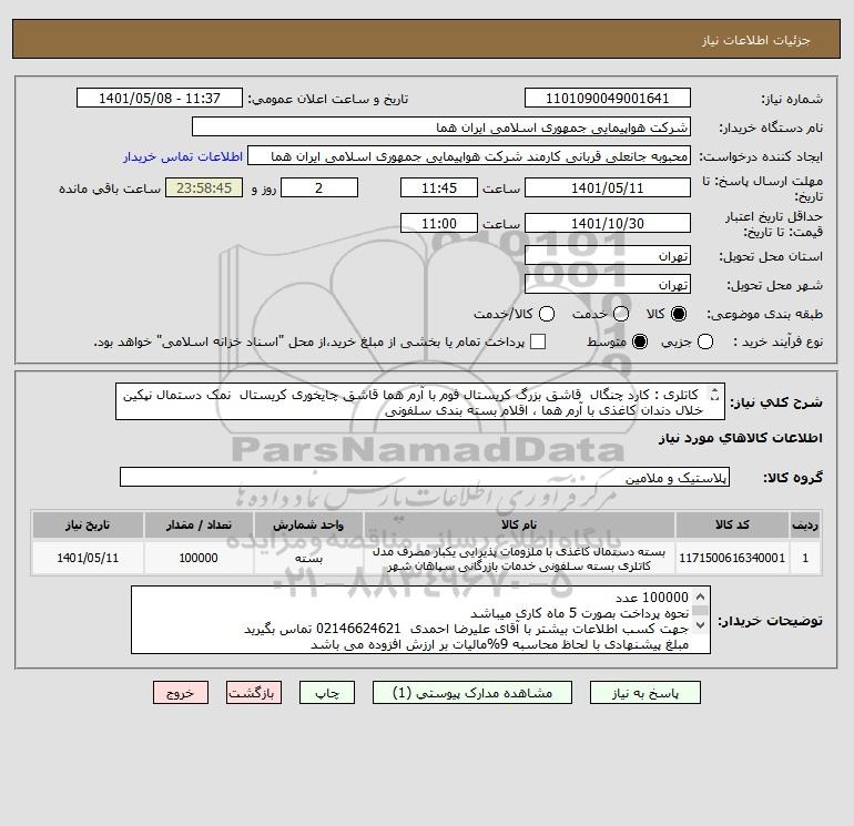 شرح کلی نیاز: کاتلری : کارد چنگال قاشق بزرگ کریستال فوم با آرم هما قاشق چایخوری کریستال نمک دستمال نپکین خلال دندان کاغذی با آرم هما ، اقلام بسته بندی سلفونی