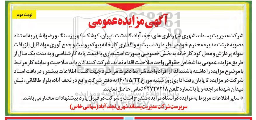 شرکت مدیریت پسماند شهری شهرداریهای نجف آباد، گلدشت، تیران، کوشک، کهریزسنگ و رضوانشهر به استناد مصوبه هیئت مدیره محترم خود در نظر دارد نسبت به واگذاری کارخانه بیوکمپوست و جمع آوری مواد قابل بازیافت سوله پردازش و محل کود کارخانه به بخش خصوصی به صورت استیجاری با قیمت پایه کارشناسی و به مدت یک سال از طریق مزایده عمومی به اشخاص حقوقی واجد صلاحیت اقدام نماید