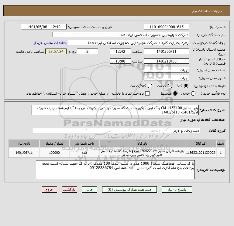شرح کلی نیاز: پتو سایز 100*145 CM رنگ آبی میکرو خاصیت کندسوزی و آنتی باکتریال ترجیحا "با آرم هما بازدیدحضوری 1401/5/9- 1401/5/10