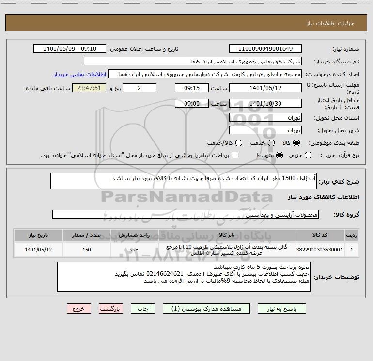 شرح کلی نیاز: آب ژاول 1500 بطر ایران کد انتخاب شده صرفا جهت تشابه با کالای مورد نظر میباشد