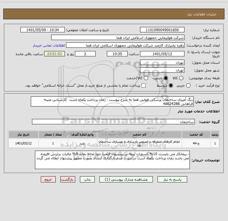 شرح کلی نیاز: رنگ آمیزی ساختمان پزشکی هوایی هما به شرح پیوست - زمان پرداخت یکماه است کارشناس متینه فراهانی 46624286
