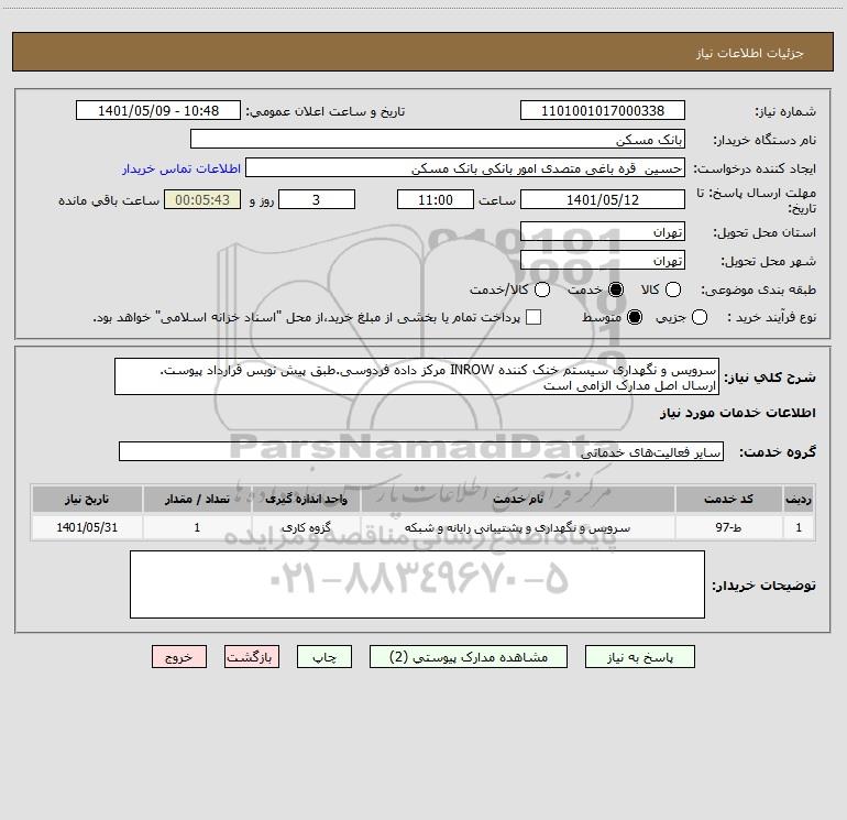 شرح کلی نیاز: سرویس و نگهداری سیستم خنک کننده INROW مرکز داده فردوسی.طبق پیش نویس قرارداد پیوست.