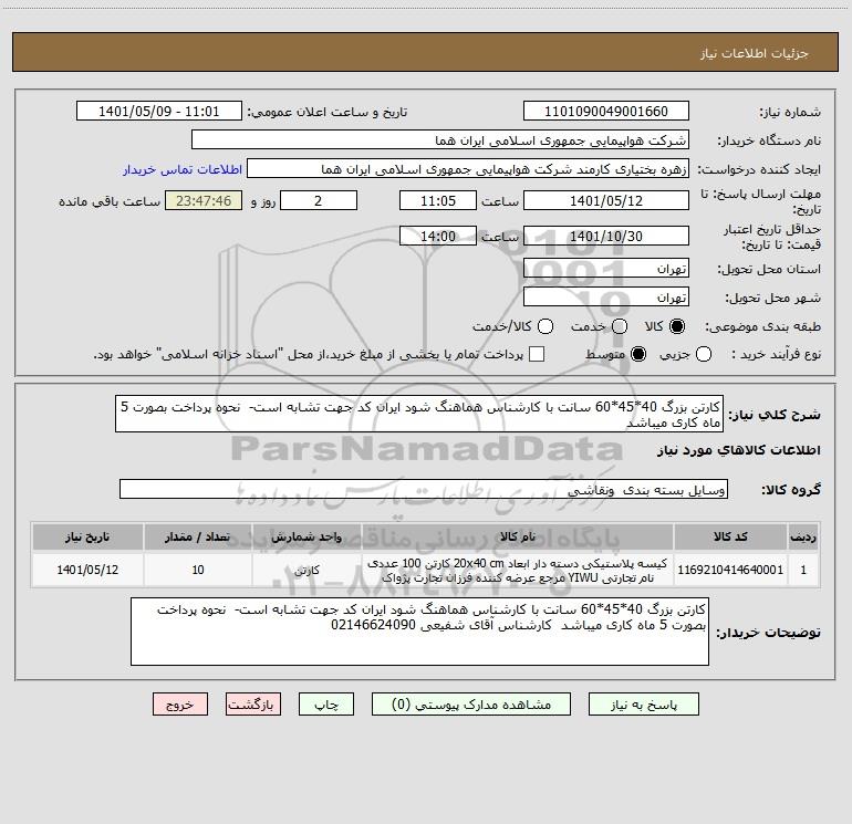 شرح کلی نیاز: کارتن بزرگ 40*45*60 سانت با کارشناس هماهنگ شود ایران کد جهت تشابه است- نحوه پرداخت بصورت 5 ماه کاری میباشد