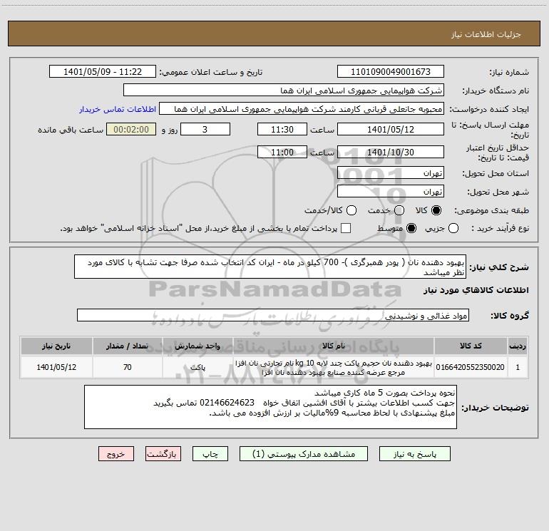 شرح کلی نیاز: بهبود دهنده نان ( پودر همبرگری )- 700 کیلو در ماه - ایران کد انتخاب شده صرفا جهت تشابه با کالای مورد نظر میباشد