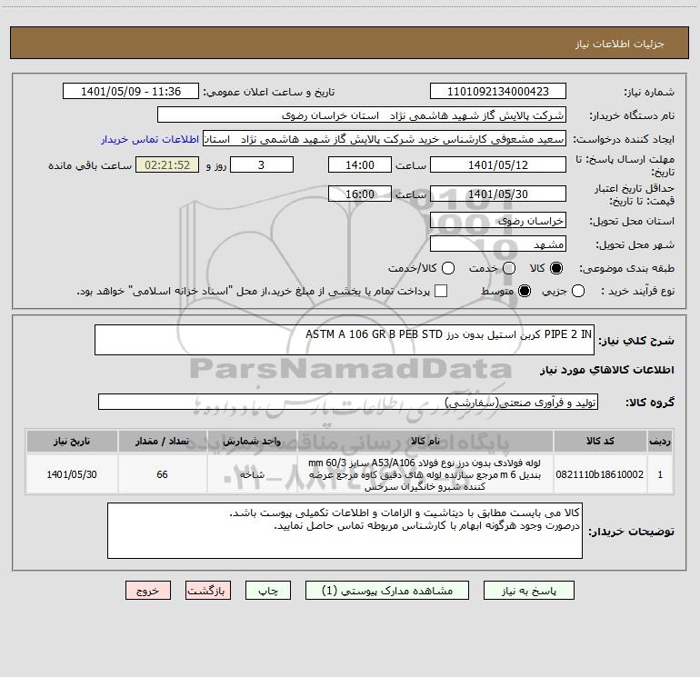 نام دستگاه خریدار:شرکت پالایش گاز شهید هاشمی نژاد استان خراسان رضوی