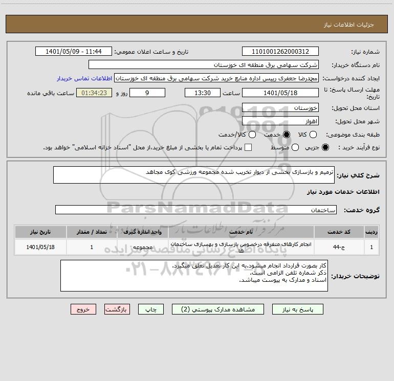 شرح کلی نیاز: ترمیم و بازسازی بخشی از دیوار تخریب شده مجموعه ورزشی کوی مجاهد