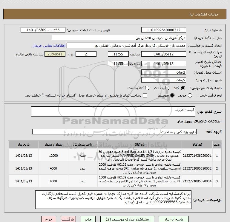 | 3 | 2132721086620004 | کیسه تخلیه ادراری با شیر خروجی مدل HK109 ظرفیت 1500 ml بسته سلفونی 1 عددی نام تجارتی BP مرجع عرضه کننده بهترینهای پزشکی پارس | عدد | 4000 | 1401/05/13 |