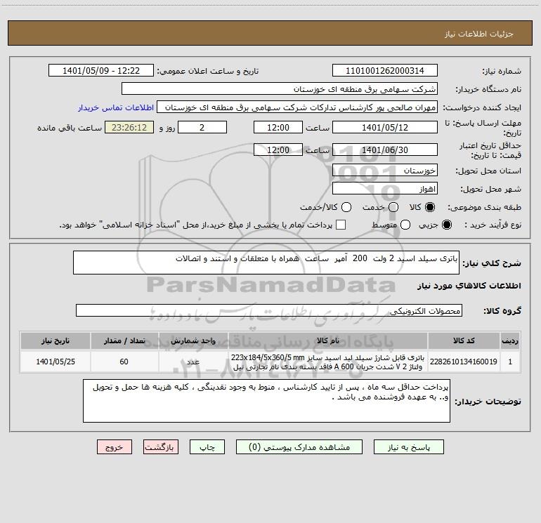 | 1 | 2282610134160019 | باتری قابل شارژ سیلد لید اسید سایز 223x184/5x360/5 mm ولتاژ 2 V شدت جریان 600 A فاقد بسته بندی نام تجارتی نیل | عدد | 60 | 1401/05/25 |